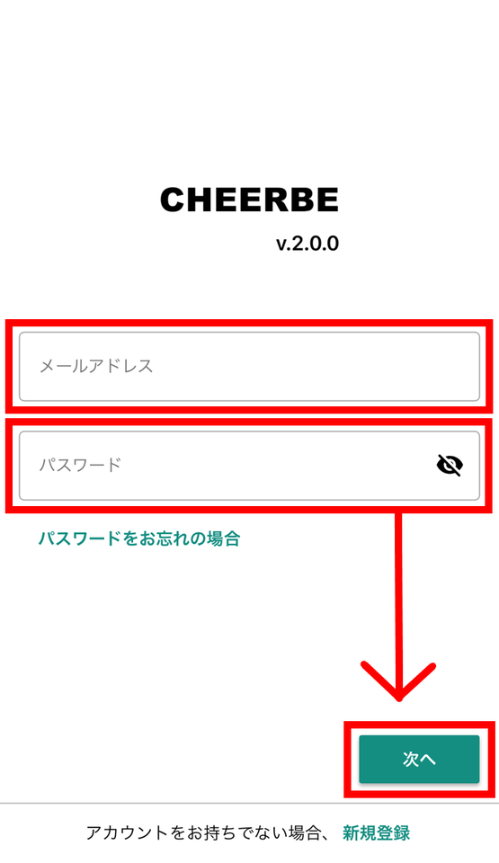 App storeまたはGoogle playstoreにて「CHEERBE」アプリをインストールします。アプリを起動後、「新規登録」をタップします。