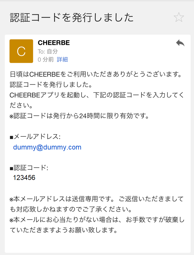 入力したメールアドレス宛に届いたメールを確認します。数字6桁の「認証コード」をコピーしてください。